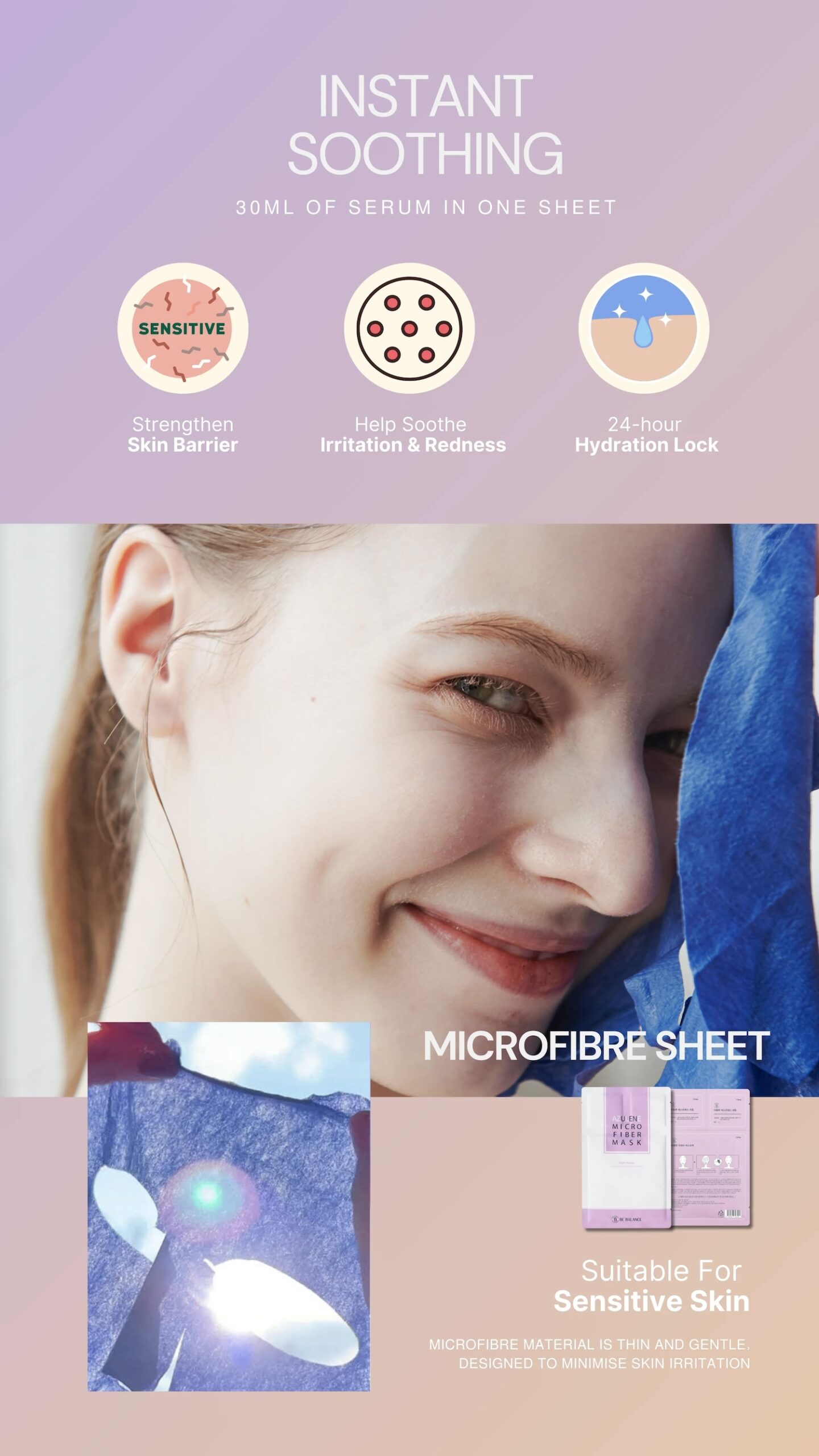 A 3-Step skincare regimen featuring a soothing serum, microfiber mash infused with Azulene extract, and a moisturizer for intense soothing and repair.
