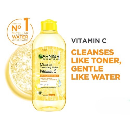 Garnier Micellar Cleansing Water Vitamin C For Dull & Sensitive Skin 400ml is a micellar cleansing water with Vitamin C cleanses skin, removes makeup, and boosts glow in 1 step. Lifts away dirt, makeup, and excess oil in just a few swipes. This facial cleanser removes makeup, leaving skin perfectly clean without over drying. This Garnier Micellar Cleansing Water with Vitamin C is gentle on skin and can be used to remove face makeup and eye makeup. The gentle cleanser is vegan and formulated without alcohol, oils and fragrance.