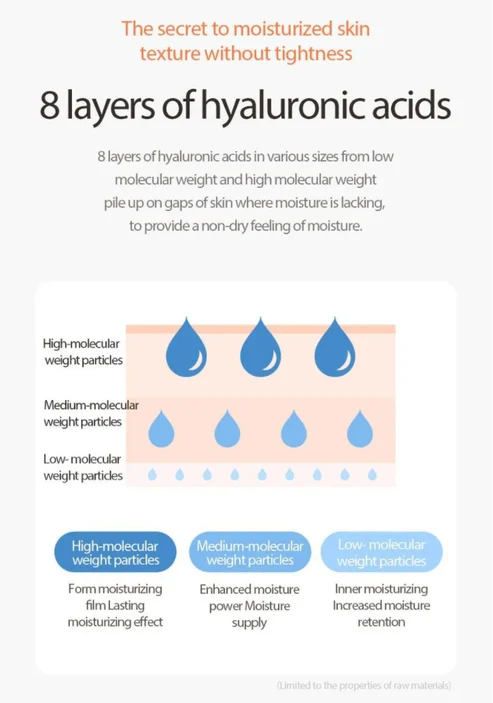 8 kinds of Hyaluronic Acid with different molecular weight offer deep and long-lasting hydration. Suitable for all skin types.