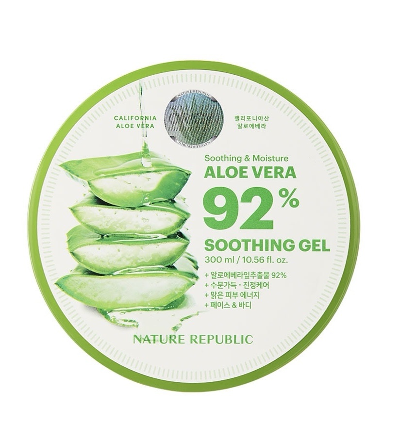 – Nature Republic Soothing Gel Soothing & Moisture Aloe Vera 92% 300ml is infused with 92% Aloe Barbadensis Leaf Extract which helps effectively soothe skin to moisturize with its refreshing application and quick absorption without stickiness. The aloe vera is produced in California and can be used on face, arms, legs, hair