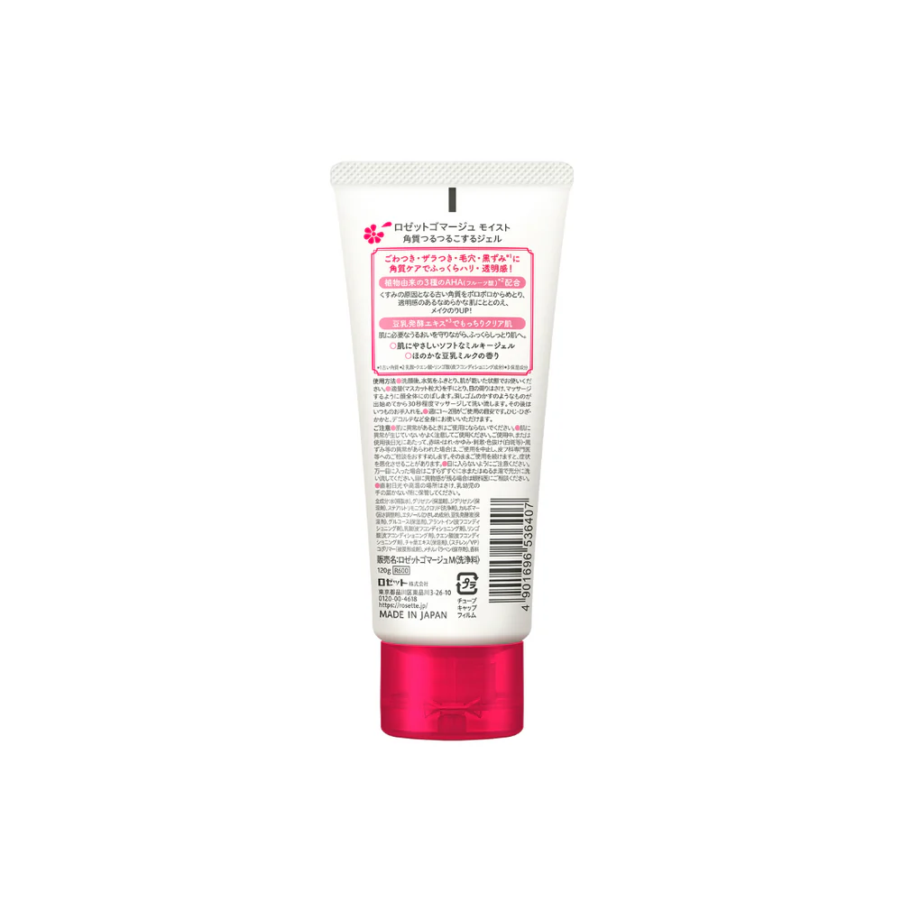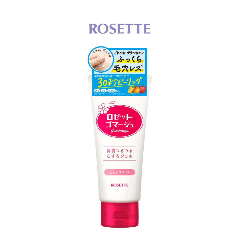 ROSETTE Gommage Peeling Gel Moist contains 3 kinds of fruit acids (lactic acid, citric acid, malic acid) which removes dirt and dead skin cells. Formulated with fermented soymilk extract to hydrate the skin, leading to plump and poreless skin. It can be used for not only face, but also other body parts such as knees, neckline, elbows etc.
