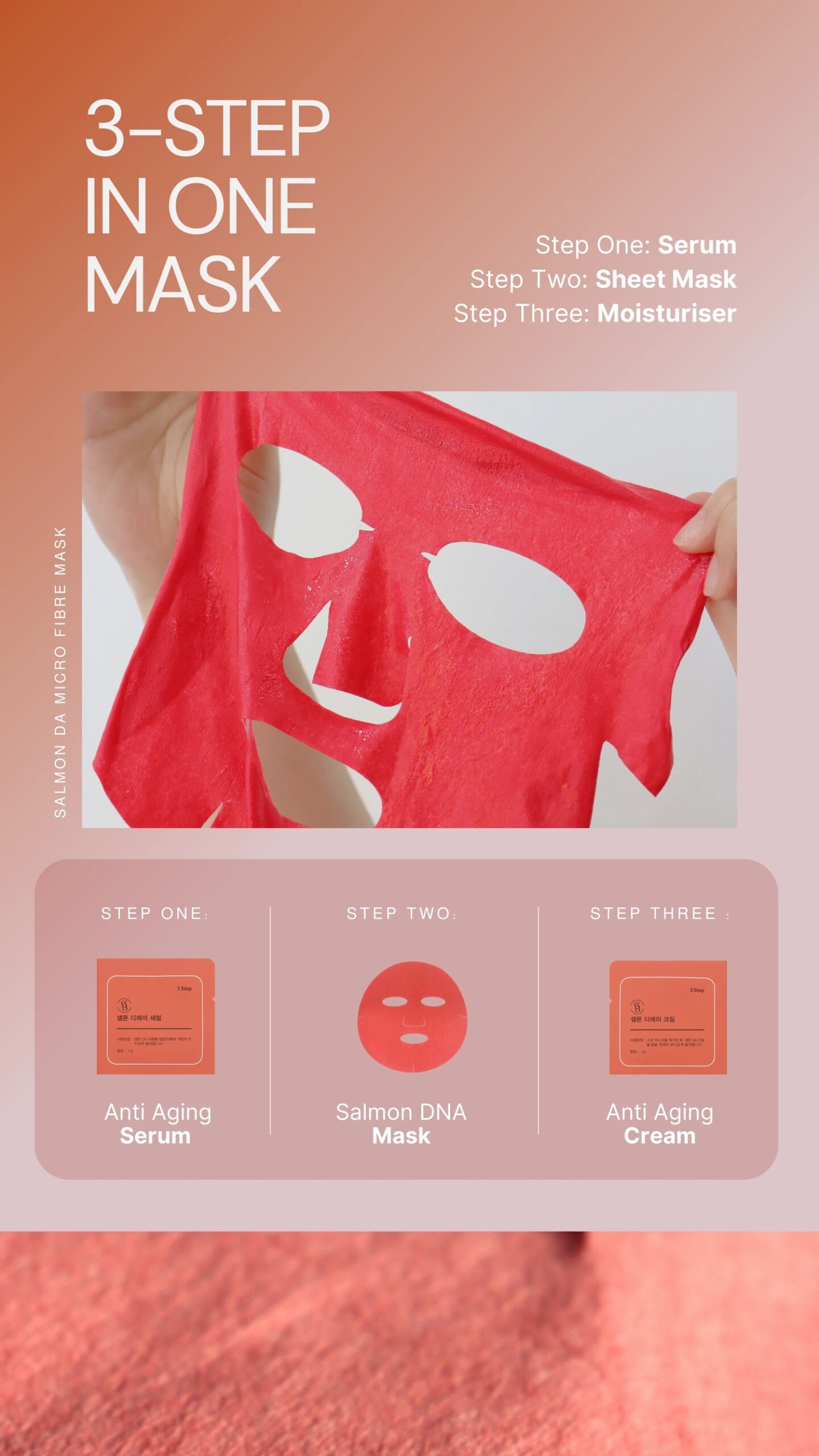 A 3-Step rejuvenating anti-aging skincare in a sheet-featuring a potent serum, microfiber mask infused with Salmon DNA, and an anti aging moisturizer.